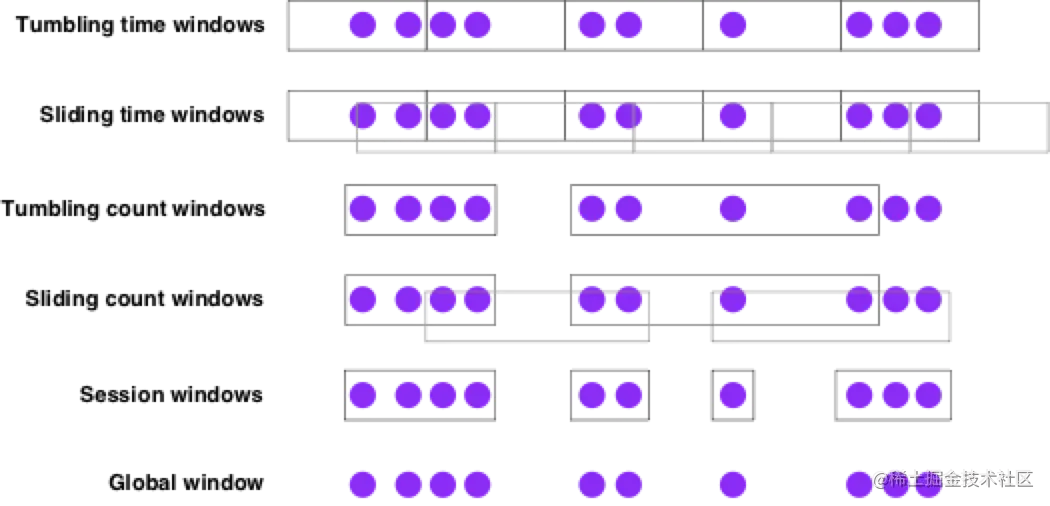 聚合事件(如 count、sum)在流处理和批处理中的工作方式不同。例如,无法计算流中的所有元素(认为流是无界的,数据是无限的)。流上的聚合由窗口来确定计算范围,例如,在过去 5 分钟内计数或最后 100 个元素的总和。