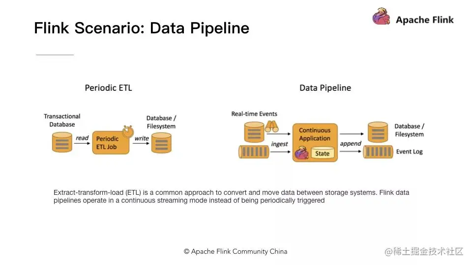 Data Pipeline 的核心场景类似于数据搬运并在搬运的过程中进行部分数据清洗或者处理,而整个业务架构图的左边是 Periodic ETL,它提供了流式 ETL 或者实时 ETL,能够订阅消息队列的消息并进行处理,清洗完成后实时写入到下游的 Database 或 File system 中。