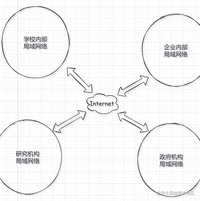 许多个类似上述的局域网组成一个大的互联网。它们彼此相连互相通信。