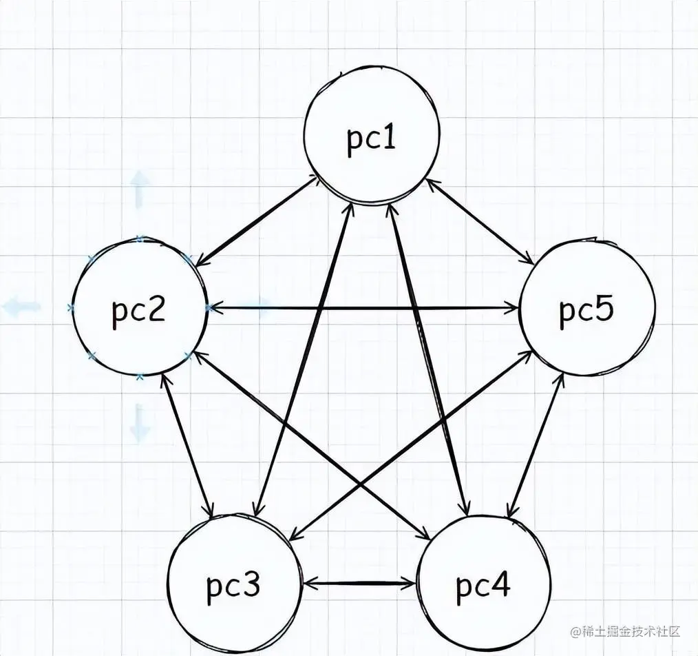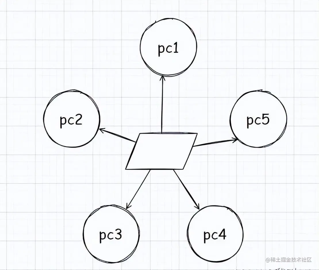首先我们需要明确的是,MAC地址的诞生早于IP地址。在计算机设计之初,设备之间使用MAC地址互相确认身份,因为当时的网络拓扑并不大,我们完全可以让两台计算机之间两两互相发送数据。如果有5个主机需要互通的话,那么它的拓扑结构可能是这样: