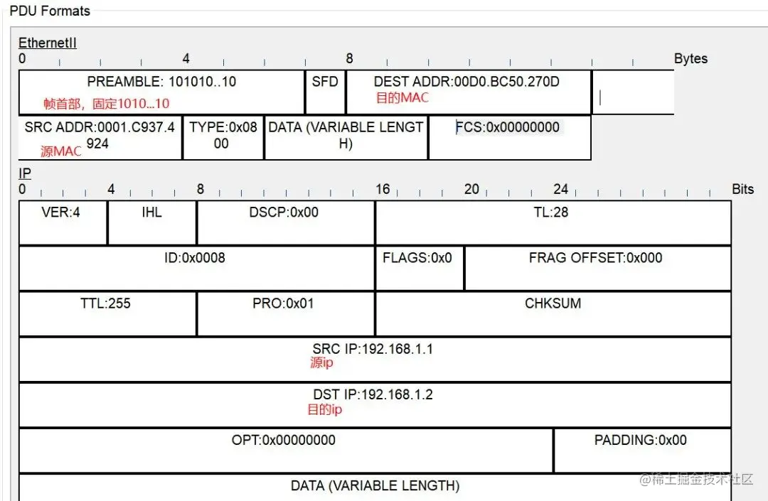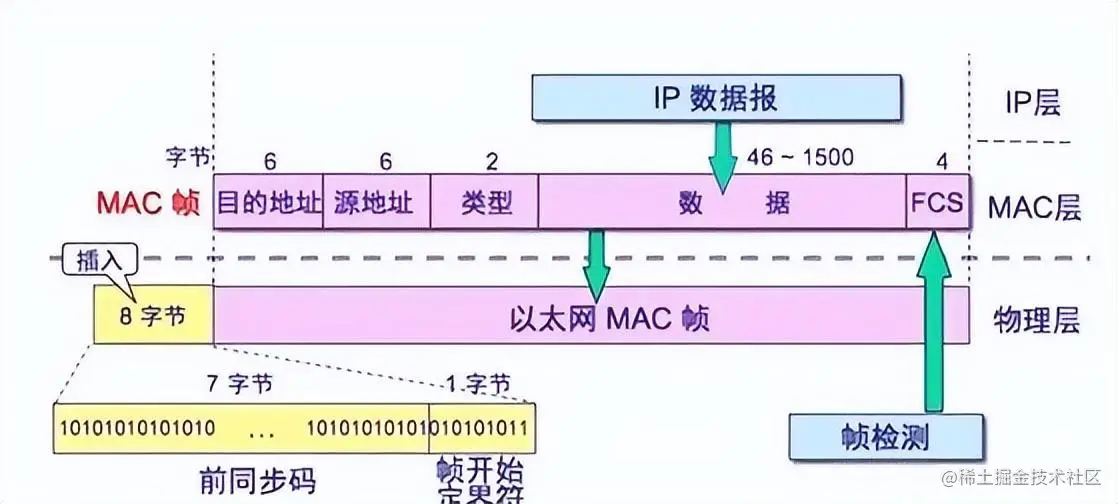 这个过程可对应网络中同一个交换机或集线器连接的局域网通信。在局域网中通信需要通过MAC地址进行通信。将数据封装成帧时会插入源mac地址和目的mac地址(如果不知到对方mac地址会发送arp广播报文获取对方mac地址)。以太网帧结构: