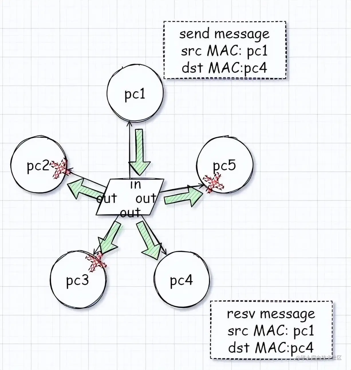 每台主机发送数据前需要携带自己和对方的目的MAC地址,因为hub集线器只是将所有数据从其他接口发送出去,它将数据的是否接收留给了主机自己判断。