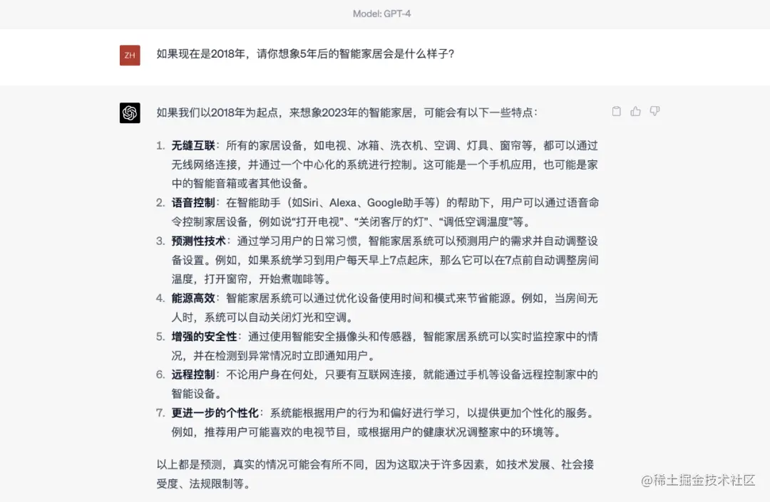 用2023年的视角来审视ChatGPT的猜想,可以发现ChatGPT俨然低估了空间智能化的速度。因为2018年以后,语音控制就渐渐成了智能化产品的标配,远程控制也被华为、小米等企业攻克。无缝互联、预测性技术及能源高效或许会让一些人感到陌生,但其实华为在全屋智能2.0就迭代了“1+2+N”模式,大致实现了这些猜想。