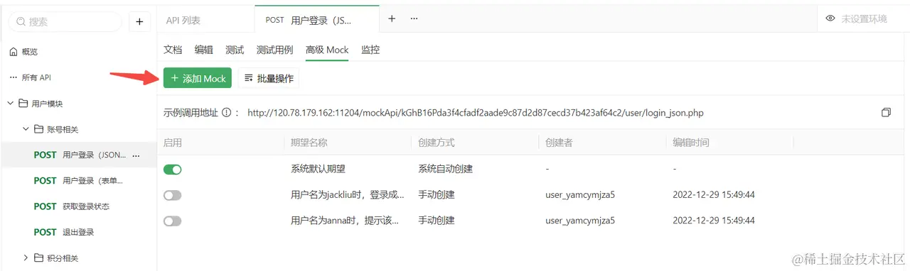 如果用户期望通过一个 url 模拟不同的请求信息时,获取对应个的返回结果模拟数据,则推荐使用高级 Mock 功能。