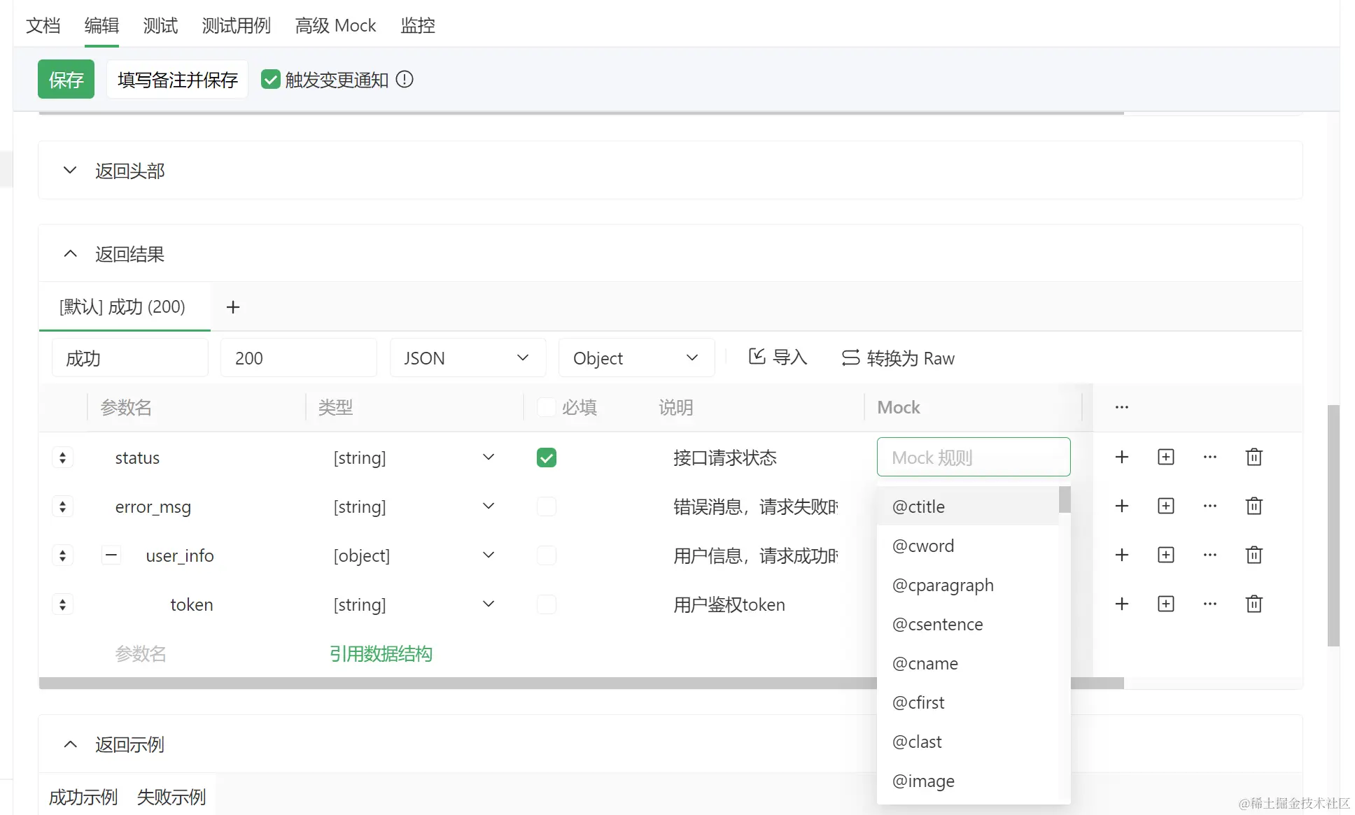 简易 Mock 功能可在编写 API 文档的时候,同时对不同的返回结果进行 Mock 配置。并且可预置智能 Mock 规则,在编写返回参数时,若参数名和字段类型匹配智能 Mock 规则时,系统自动填入该参数的 Mock 规则。配置简易 Mock 后,API 文档会自动生成 Mock URL,用户可复制该 URL 直接调用得出想要的数据结果。