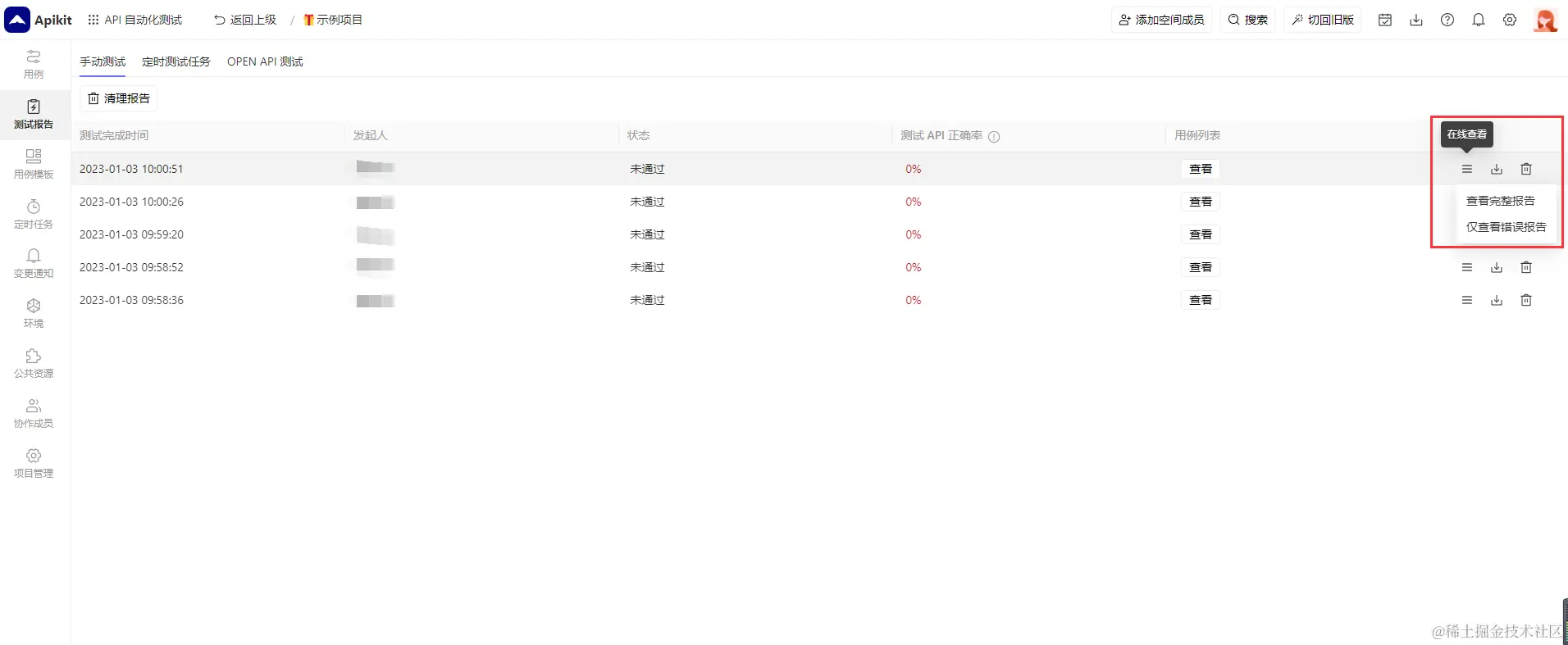 进入测试报告页面,在这里会列出所有手动批量测试、定时测试、Open api 测试的测试报告。在定时测试报告列表,你可以在这里选择某次测试任务,依次点击查看详情 - 全部。在弹出的 HTML 页面可查看详细记录该次测试报告的所有信息。