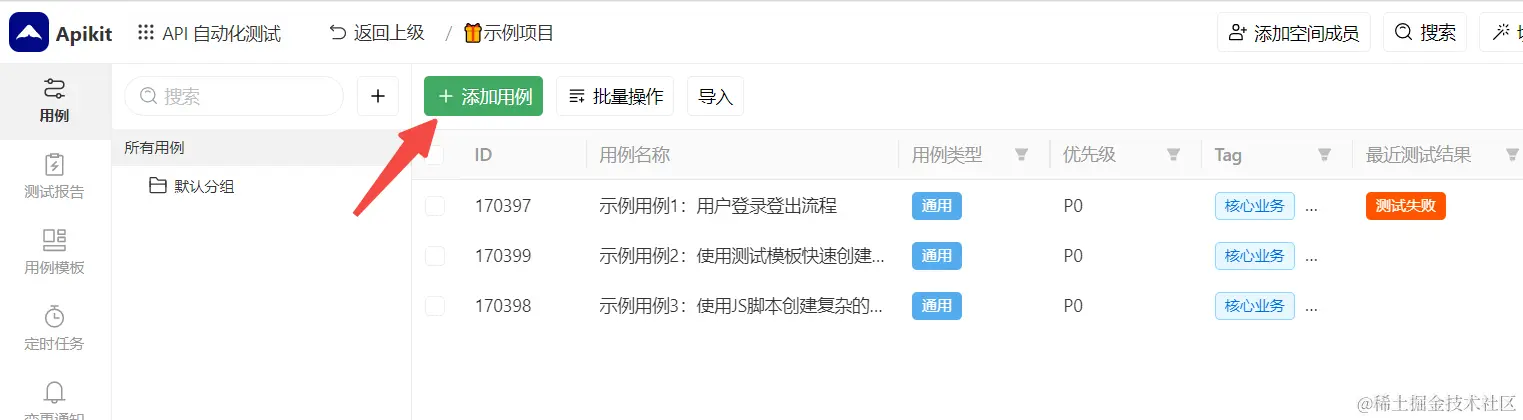 进入用例管理页面,点击 添加用例 按钮,在弹窗中输入测试用例的名称,然后点击确定: