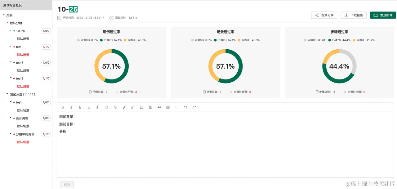 用户查看测试报告详情时,可以编写测试总结。例如测试背景,测试目标以及测试结果分析。