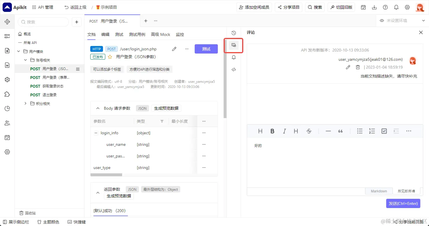 在线分享 & 导出,版本管理与评论,让跨团队协作更流畅。可在线分享 API 文档或导出为离线文件,方便开发协作;对 API 信息进行版本管理,可任意切换、对比版本,了解改动内容;可对 API 文档发表评论,评论会按照版本进行归类;