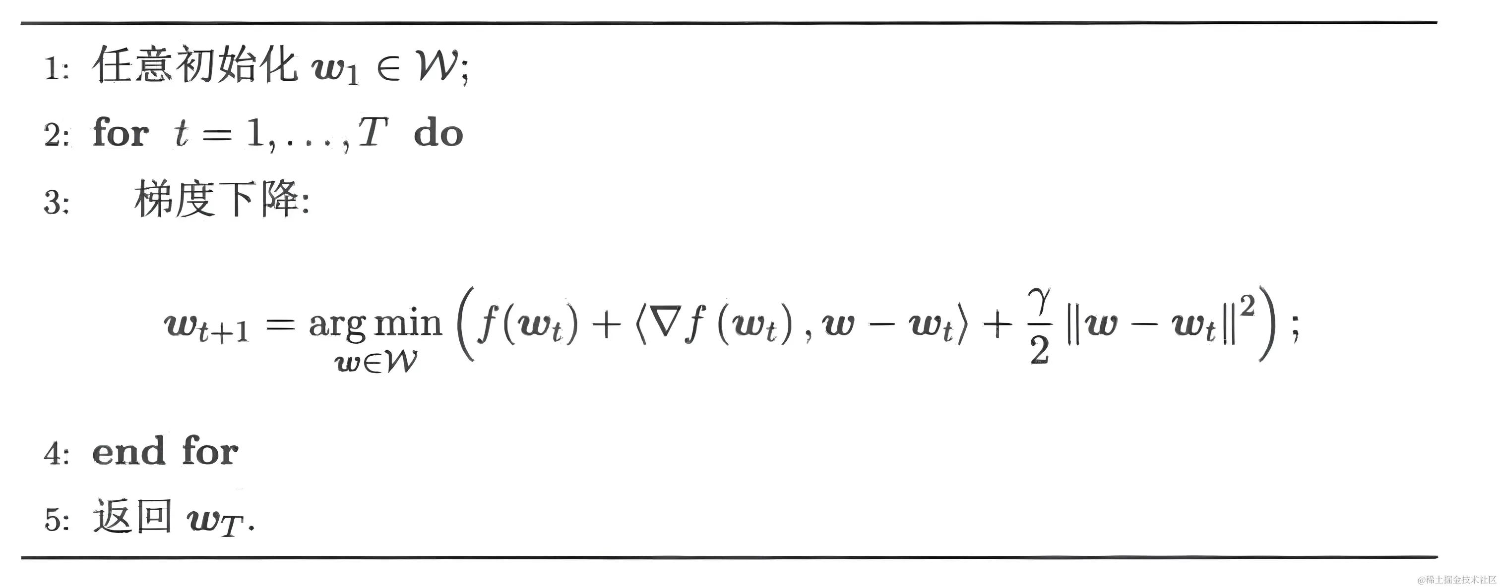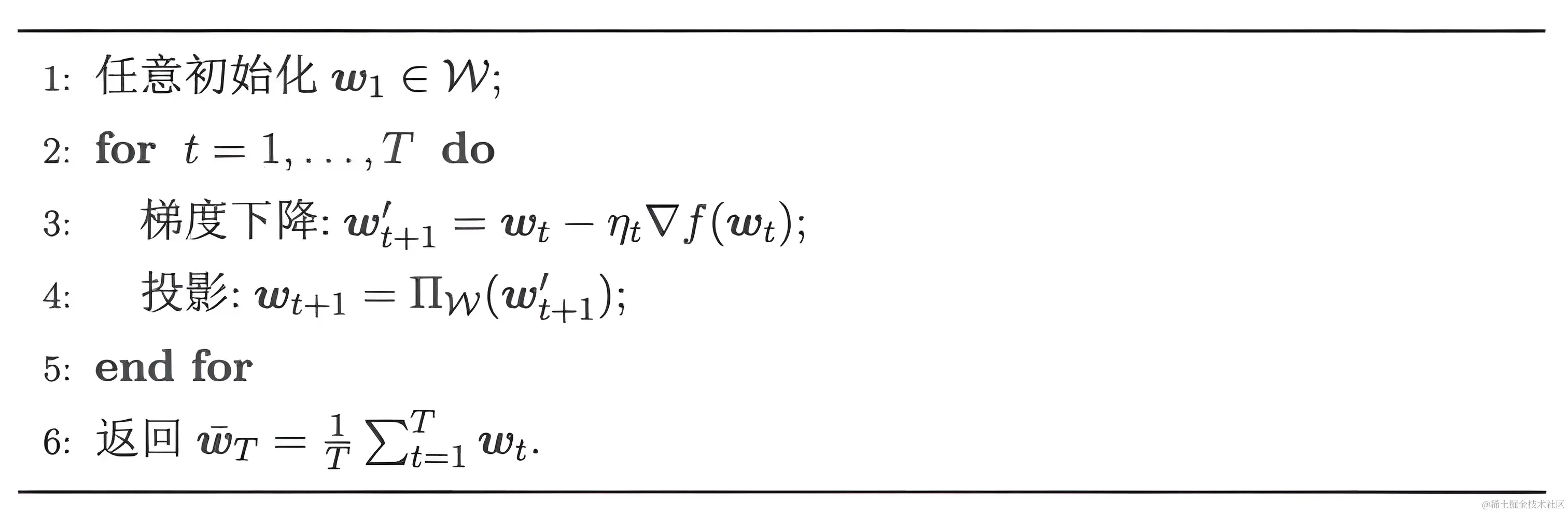 在第 t 轮迭代中,首先计算函数 f(⋅) 在 wt 上的梯度 ∇f(wt),然后依据梯度下降 wt+1′=wt−ηt∇f(wt) 来更新参数,其中 ηt 为步长。在原始问题中存在 w∈W 的约束,但是通过梯度下降获得的中间解 wt+1′ 可能不满足约束条件,因此需要对其进行投影 wt+1=ΠW(wt+1′) 保证其属于 W,投影操作对应的定义为 :