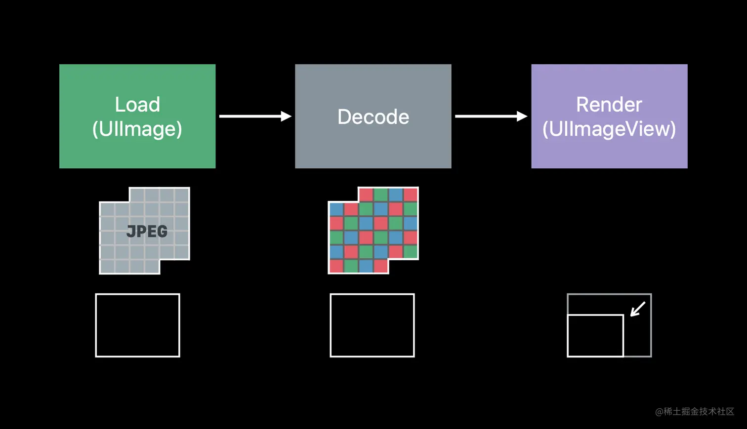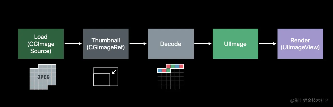 而解码就是从 Data Buffer 生成 Image Buffer 的过程。Image Buffer 会上传到 GPU 成为 Frame Buffer,GPU 以每秒60次的速度使用 Frame Buffer 更新屏幕。