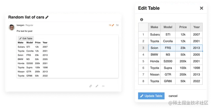 同时也可以编辑表格内容,当你保存后,这个组件将会自动帮你把表格保存为 Markdown 格式。