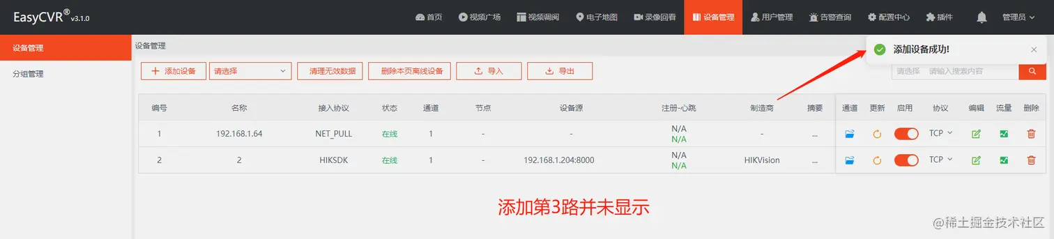 有用户反馈,使用EasyCVR过程中,出现了添加设备异常的情况,提示添加成功,但并不显示,如下: