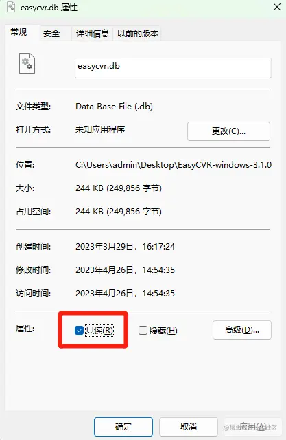 3)出现这种情况我们优先考虑数据库是否被锁或无写入权限,在Linux环境,权限很容易就能查到。而此现场为Windows环境,我们可以右键数据库文件,即EasyCVR安装目录下的easycvr.db文件,查看属性,此时的数据库为【只读】状态。