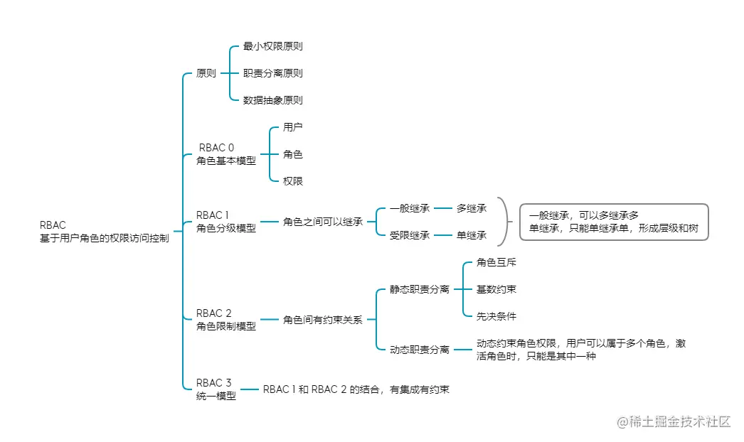 对于 RBAC 其他的模型,都是基于 RBAC 0 上面进行的衍生和变化,增加了一些继承和约束,但是原理还是一样的