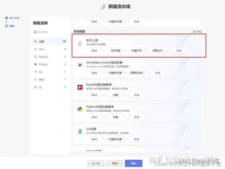 4 流水线会预置一个“新手上路”系统模板,选中模板,然后点击“确认”进编排流水线页面
