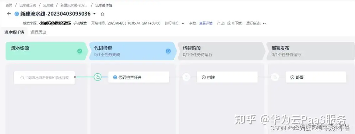 2、运行流水线会停留在流水线详情页,详情页内展示了流水线的阶段任务运行情况