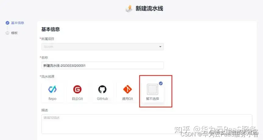 3 流水线基本信息系统已经自动填写,流水线源暂不选择,单击“下一步”进入流水线模板选择页