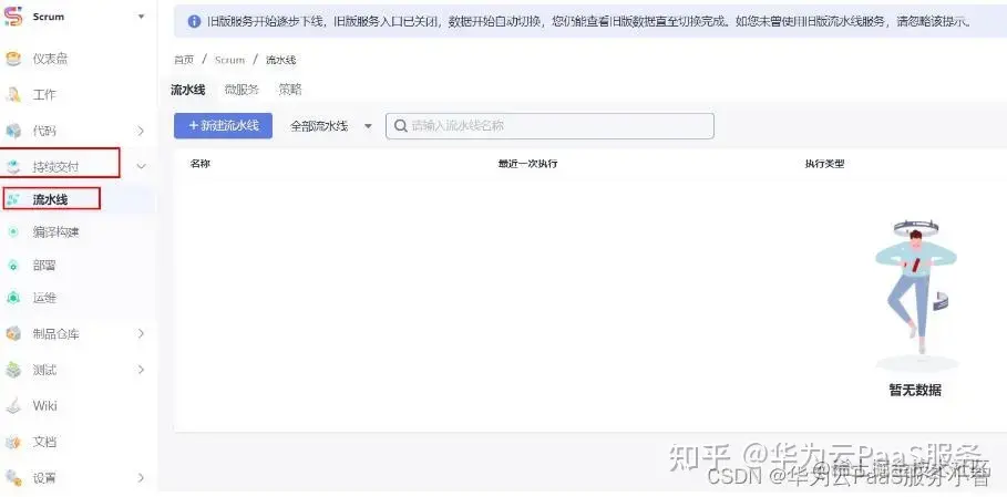 1 进入Scrum项目,在项目左侧导航栏,依次选择“持续交付”->“流水线”切换到流水线列表
