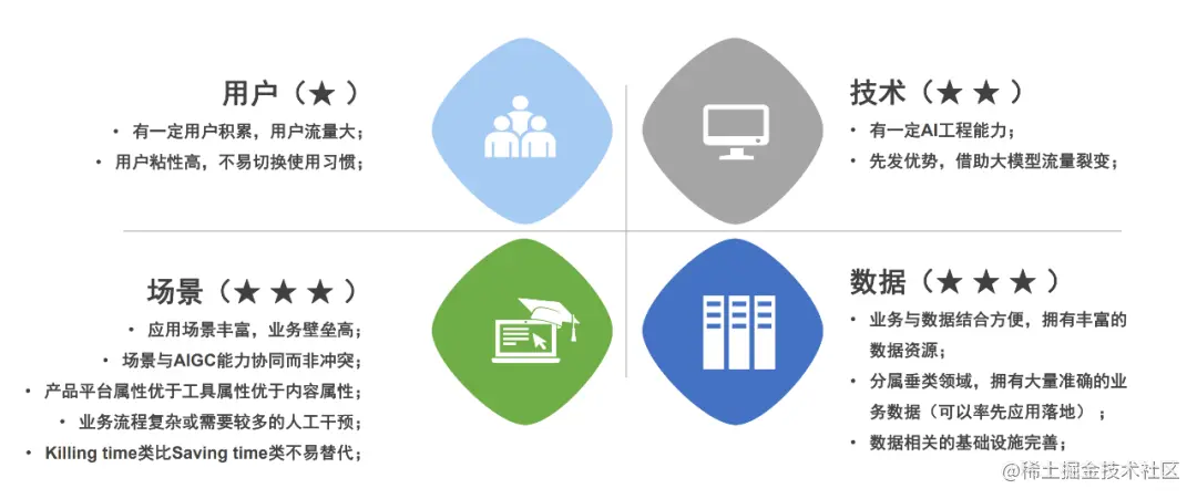 **其三,技术成果总是在合适的经济节点上出现回报,但需要企业本身具备适宜的业务基础。**国信证券5月5日发布研报指出,大模型技术变革条件下企业要更上一层楼,需要大致四个禀赋:“原有产品场景壁垒高,且受益于AIGC出色的信息获取、内容生成能力;有独特垂直的高质量数据;有用户粘性与深度;本身有较强的AI技术研发与落地能力。”