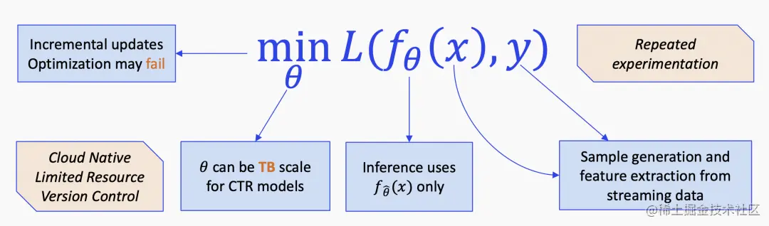 另一方面,训练引擎仅仅只是整个搜推广算法工程化的冰山一角。模型推理引擎,实时数据流,ABTest实验平台,容器调度平台等等都需要一整套完整的Infrastrature,这里写得最详细的当然是五福老师的 AI OS综述 。笔者也在下图大致梳理了在工业级机器学习应用中,面临的一些常见问题。