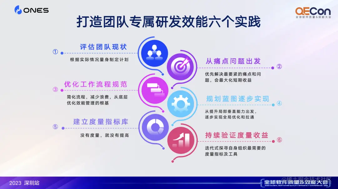 我把方法论一共归纳为六点,也叫「打造团队专属研发效能提升路径六个实践」: