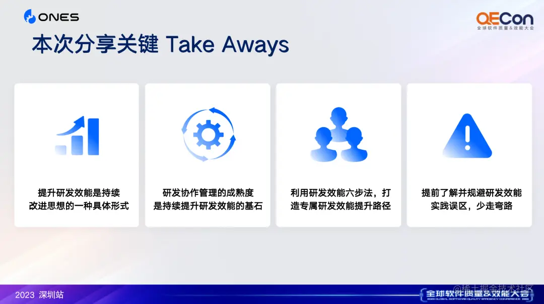 近日,ONES 受邀参加 2023 QECon 全球软件质量 &效能大会(深圳站)。在会上,ONES 研发效能改进咨询顾问陈仪,发表了主题为《如何为研发团队打造专属的效能提升路径》的演讲。