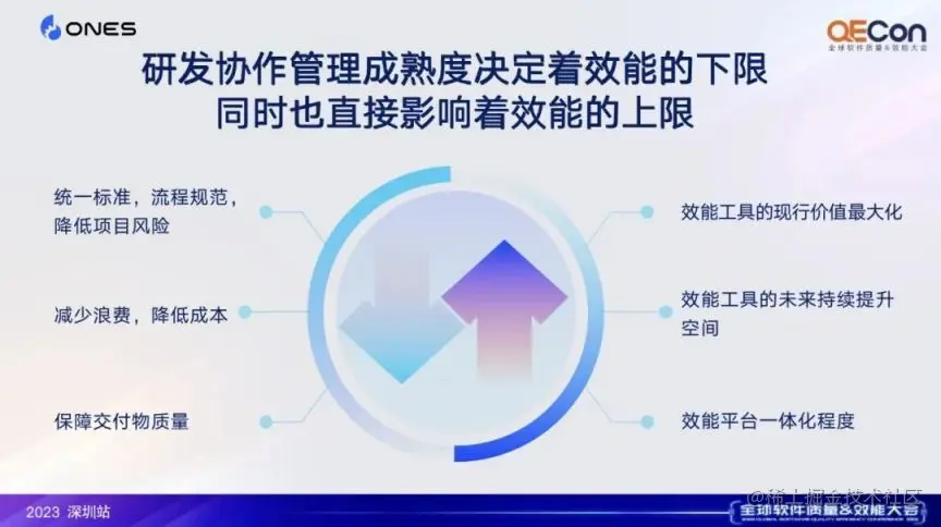 通过定义,我们可以认为,研发效能是广泛且全面的。然而,我们往往追求研发效能工程侧的实践,比如 DevOps 平台建设、DevOps 工具的使用,而忽略了研发管理过程侧的实践。但后者正是整个研发项目的基础,所以我想提出一个观点:研发协作管理的成熟度,决定了效能提升的下限,同时直接影响了效能提升的上限。