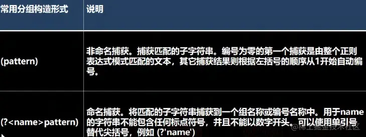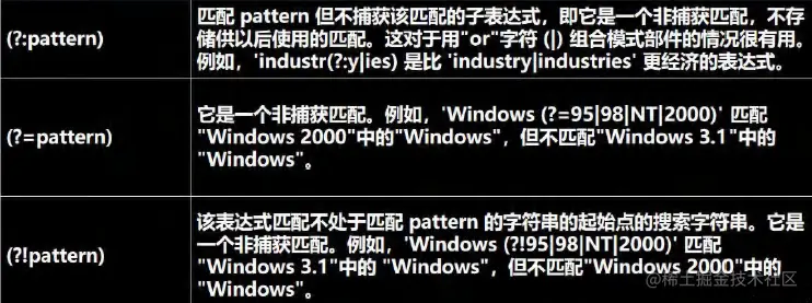 (?:pattern) | 匹配 pattern 但不捕获该匹配的子表达式,即它是一个非捕获匹配,不存储供以后使用的匹配。这对于用"or"字符 (|) 组合模式部件的情况很有用。例如,'industr(?:y|ies) 是比 'industry|industries' 更经济的表达式。 | |