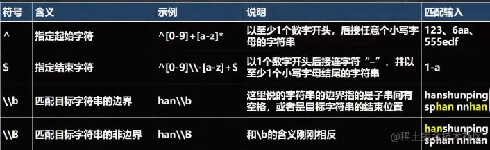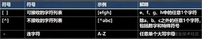 [^a-z] | 反向范围字符。匹配不在指定的范围内的任何字符。例如,"[^a-z]"匹配任何不在"a"到"z"范围内的任何字符。 | |