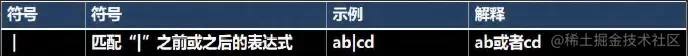 | *`x | y`* | 匹配 x 或 y。例如,'z|food' 匹配"z"或"food"。'(z|f)ood' 匹配"zood"或"food"。 |