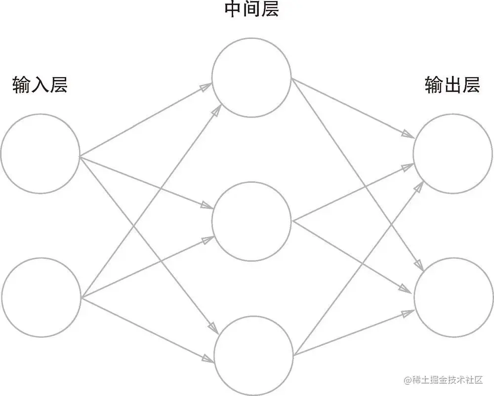 神经网络通常由三个部分组成,分别是输入层、隐藏层(中间层)、输出层,其中隐藏层可能有多层。这里以下图为例: