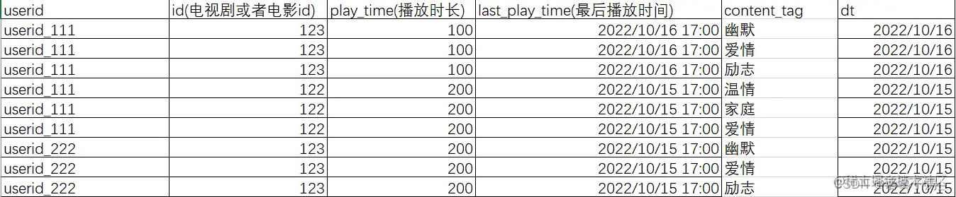 上面是一张播放行为表,涵盖了基本的播放行为数据,和一张为tag维表(一个电视剧或者电影会打上非常多的标签,表中只是罗列了3个)
