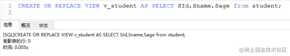 CREATE OR REPLACE VIEW v_student AS SELECT SId,Sname,Sage from student;