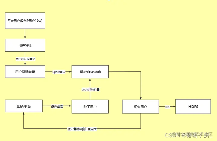 通过使用ES向量化查询功能完成扩量,具体实现会涉及到扩量查询采用Spark 提升并发性,通过配置扩量倍数参数来获取每一个种子用户的Top N 扩量,最终将扩量后的数据写入HDFS目录同时通知营销平台扩量完成。