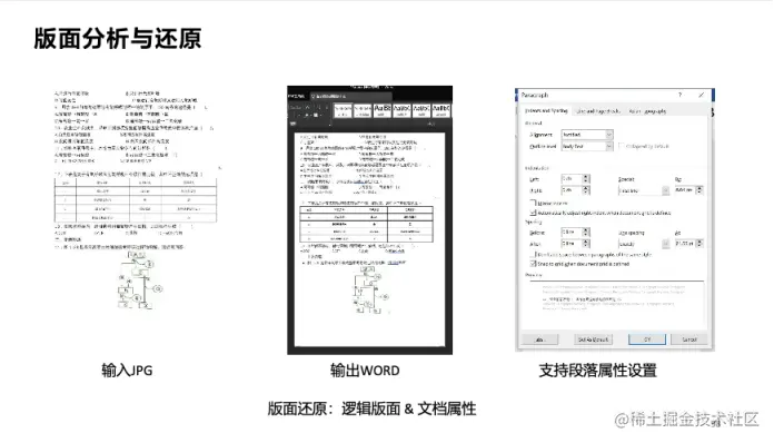 由于版面复杂多变、文本内容多样化等原因,文档被拍照、扫描成电子文档过程中时常出现漏字、错位,合合信息持续突破版面分析技术在版面分割、区域间的逻辑关系处理等方面的难题,通过智能文字识别、智能图像处理等核心技术,确定文档中的文字位置、字体、大小和排版方式等信息,实现版面的分析和还原。
