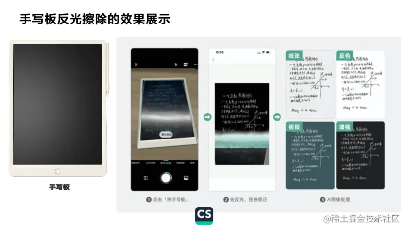 除文档图像的通用场景外,合合信息对特定垂直场景下的图像也能进行预处理,针对手写板图片中出现的反光问题,通过算法模型对反光进行“擦除”。