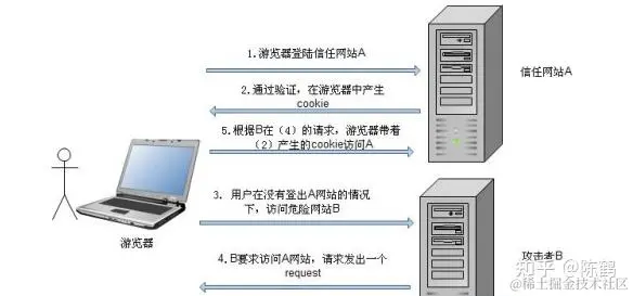 2 . 在用户没有登出站点 A 的情况下(也就是 cookie 生效的情况下),访问了恶意攻击者提供的引诱危险站点 B (B 站点要求访问站点A)。