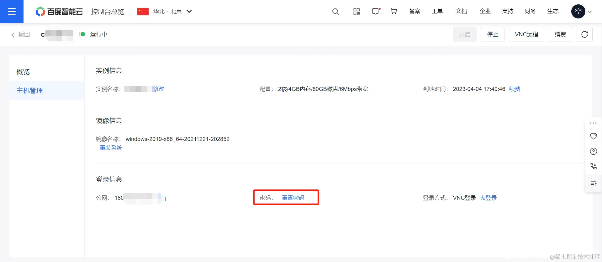 到主机管理界面后 我们第一个要做的事情就是重置密码 密码旁边有一个公网 这个可以复制一下 解析域名的时候会用到这个公网IP