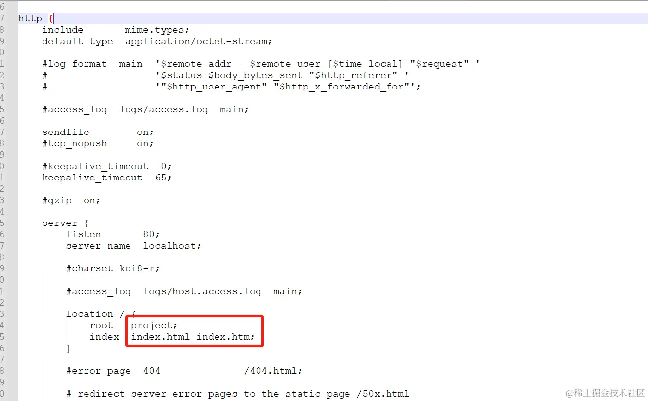 这里主要修改圈出来的root index两项内容 root是项目所在的基础路径位置 index是配置要默认跑的文件 如果你想跑的文件是demo.html 那就修改成demo.html 我这里是vue打包出来的dist文件夹中的内容贴进来的 默认跑index.html 所以我就没修改 只是改了个root的路径 因为我在nginx文件夹内建了project文件夹 存放默认内容 所以这里这样配置的 当然也可以写盘符路径什么的 但还是这样比较方便 我这里写的比较细 主要是针对新手看的 对这方面懂的可以略过