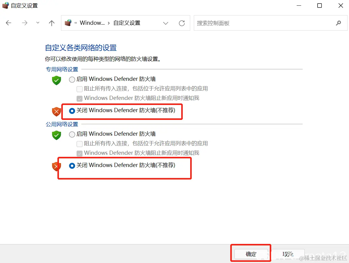 选择关闭Windows Defender防火墙 并确定