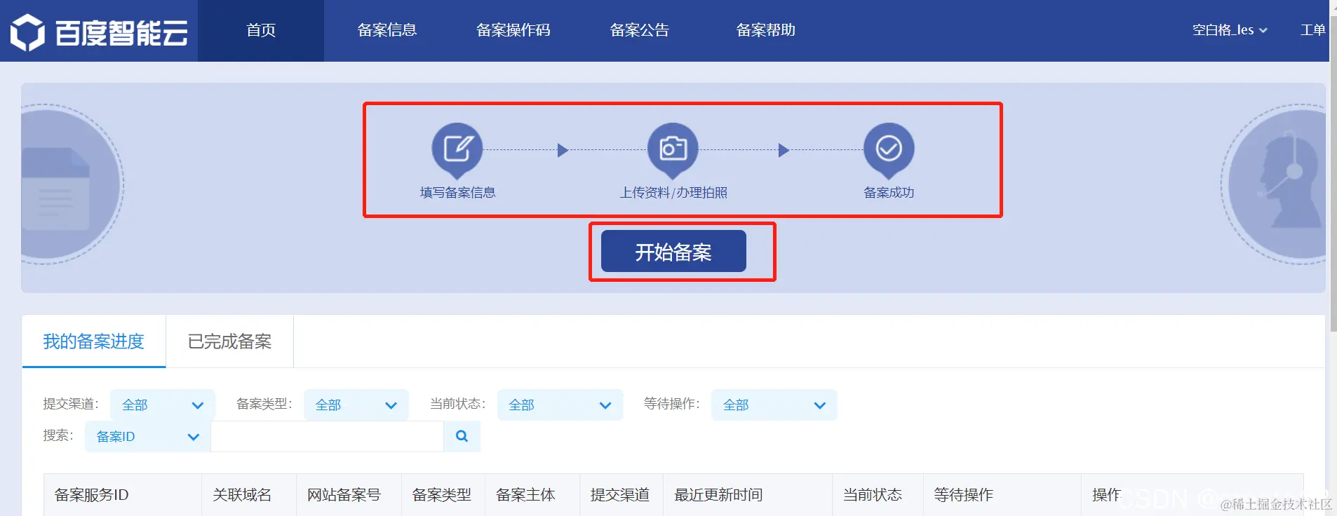 然后我们去给域名进行备案 如果没备案成功的话 域名是不能使用的 只能使用公网IP去访问 域名备案一般4-5个工作日 首先回到域名管理 点击未备案 会进入 如下界面 按照上面的要求 填写备案信息 填写完成后 需要等待2个工作日初审 我这边信息不完善 收到了短信 提示初审不完善 需要修改资料备案是不收费的 所以按照步骤操作就行了