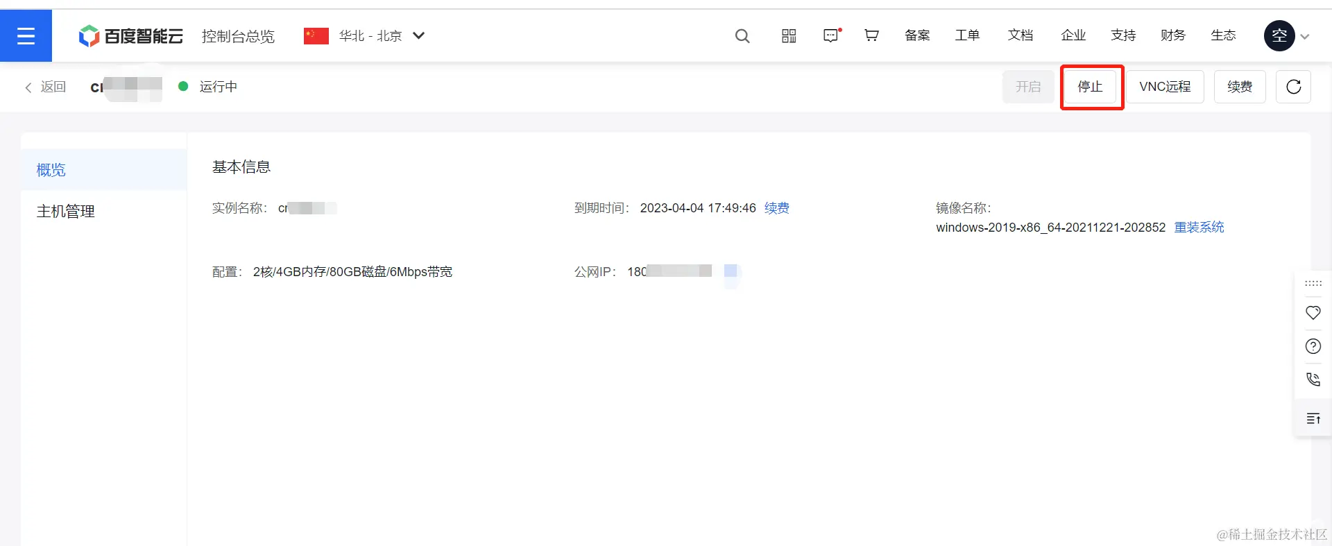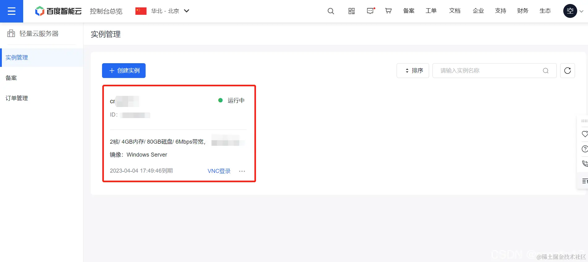 进入当前页面 就有直接运行中的实例 当然如果我们买多台 就可以展示多台 我这里只买了一台 点击我红框圈的实例 进入到主机管理界面