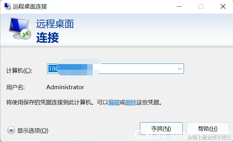 计算机名填写公网IP 用户名使用默认用户名Administrator