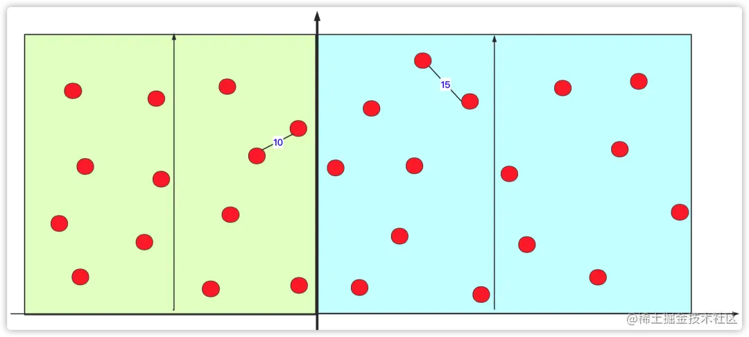 在具体的优化方案上,按照x或者y的维度进行考虑,将数据分成两个区域,先分别计算(按照同方法)左右区域内最短的点对。然后根据这个两个中较短的距离向左和向右覆盖,计算被覆盖的左右点之间的距离,找到最小那个距离与当前最短距离比较即可。
