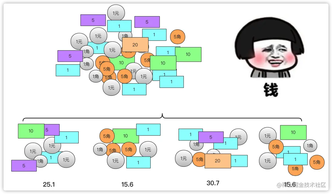 - 计算每个小堆钱的方式和计算最大堆钱的方式是相同的(区别在于体量上)