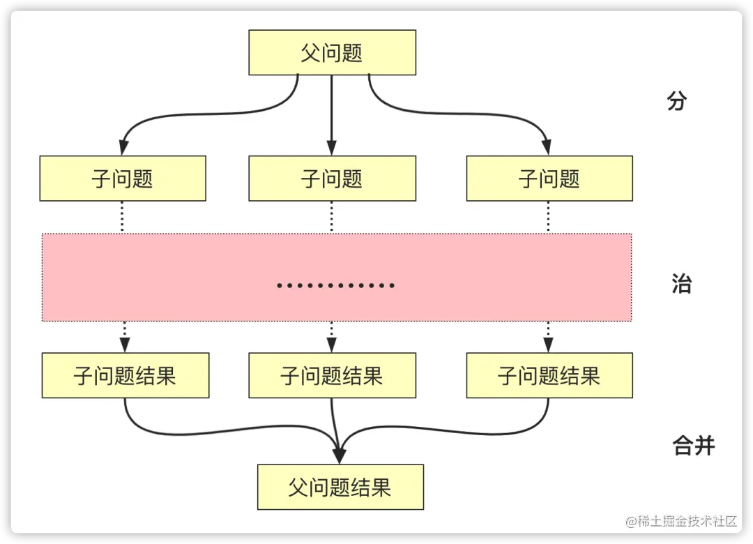 你可能会疑惑分治算法和递归有什么关系?其实分治重要的是一种思想,注重的是问题分、治、合并的过程。而递归是一种方式(工具),这种方式通过方法自己调用自己形成一个来回的过程,而分治可能就是利用了多次这样的来回过程。