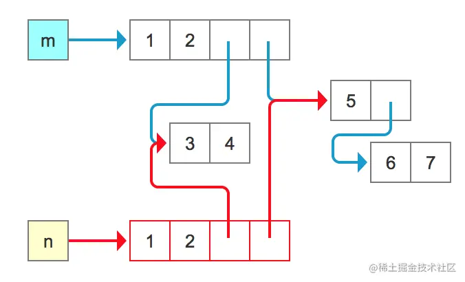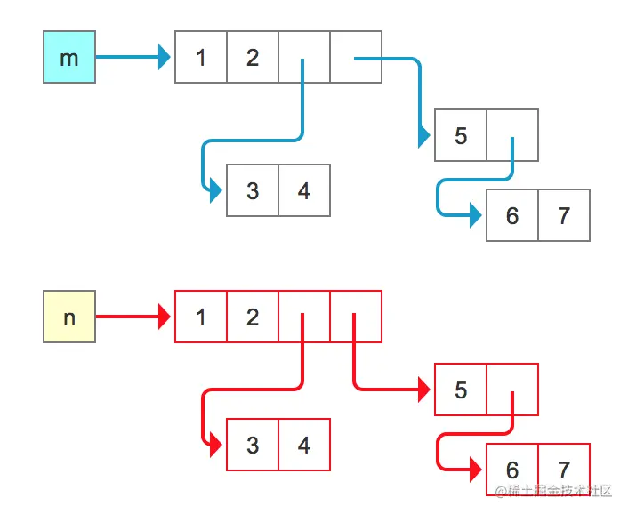 用 id 验证下就知道,m 和 n 仍然是同一个东西。那么他们内部的元素自然也是一样的,对其中一个进行修改,另一个也会跟着变: