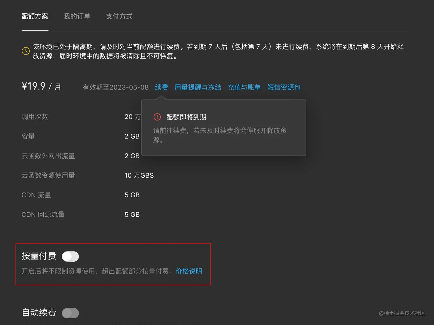 - 因为精修过得照片都很大,压缩过后也大,用着用着突然有天就图片都不加载了,上云开发后台一看是流量用完了。首先去充点钱,开启按量付费。然后去存储配置把缓存配置改成30天了。