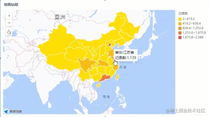 在这一步我们还可以对可视化组件进行OLAP分析操作,比如FineBI如果想要实现国家地图与省份地图的切换,就可以使用钻取功能,将某个特定分组数据按第二维度继续细化的方式。